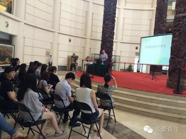 參觀完館藏珍品后,愛濤文化產業公司總經理助理、研究員級高級工藝美術師呂元先生為大家做了一場題為《蘇繡的前世與今生》的藝術講座。講座在宏偉的木雕巨作“四大名柱”下開講,呂元先生旁征博引,從中華民族的起源講起,系統而細致地將蘇繡這一民族傳統工藝的前世今生講得精彩透徹,獲得了青年同事們的一致好評。
